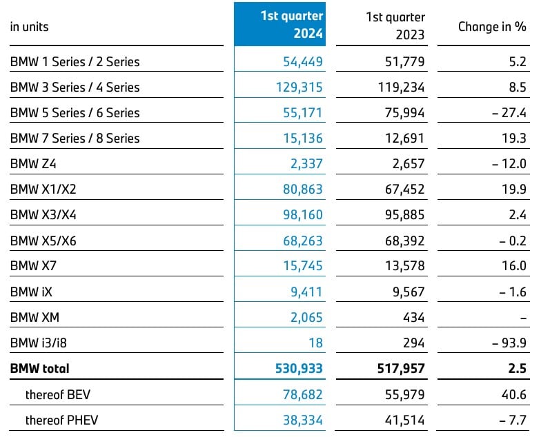 We’ve already learned that BMW had record deliveries in the first quarter of the year, but how did it get there? The 2.5% jump in demand to 530,933 cars is detailed in a sales chart. Annoyingly, the German luxury brand still doesn’t break down sales for each model. Instead, it bundles the 1 Series with the 2 Series, the 3er with the 4er, and so on.