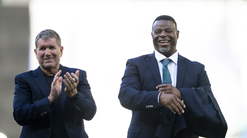 Former teammates Edgar Martinez, left, and Ken Griffey Jr. in 2023 during pitcher Felix Hernandez’s induction into the Mariners Hall of Fame. (AP)