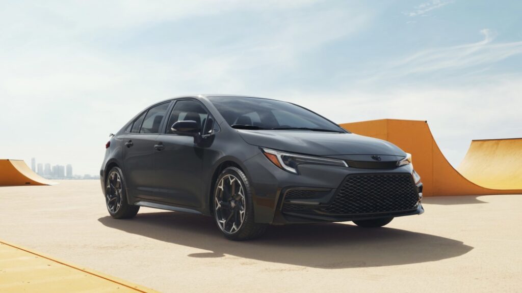 The 2025 Corolla FX Edition is based on the SE trim level and visually differentiated by a rear spoiler, satin-black 18-inch alloys with black lug nuts, as well as black badges and black mirror caps. All will have a Midnight Black roof, but the FX is offered in Midnight Black and two other colors — Ice Cap (white) and Underground (gray) — which will have a two-tone look.