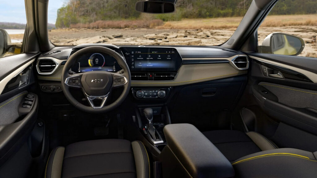 After it was improved for the 2024 model year with bigger new displays that modernize the dash, the Trailblazer’s interior design and styling now resembles other Chevy crossovers.There’s still plenty of black plastic switchgear, but it doesn’t feel cheap or especially low-rent for the money. The interior plastics are dressed up with interesting textures, and colorful trim pieces help keep the interior from looking dull or dreary. The Activ trim has some nice touches like yellow stitching and standard heated front seats and steering wheel. The RS gets similar comfort equipment, a flat-bottom leather steering wheel and red interior accents for a sporty look. The available eight-way power driver seat allows for a long range of movement and would be suitable for taller drivers.