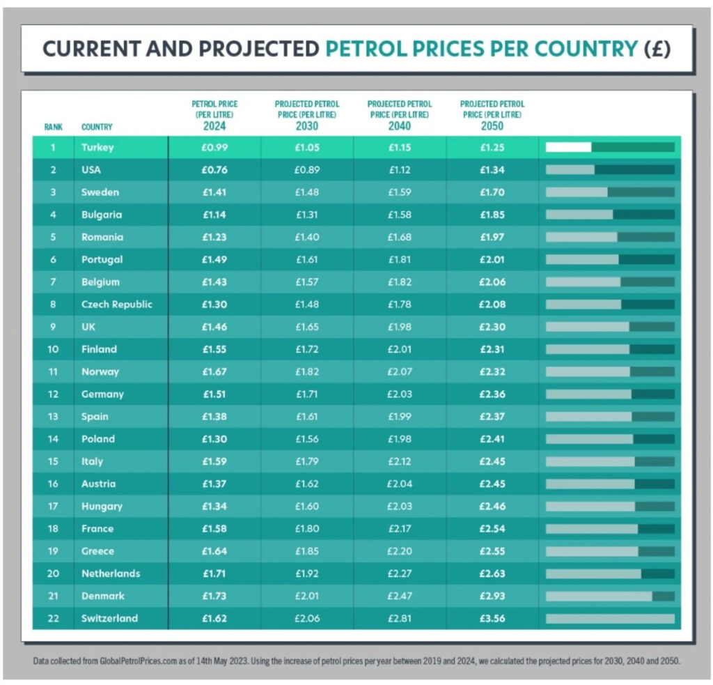 Diesel prices are one thing, but gas (petrol) prices are another. Switzerland is expected to have the highest gas prices by 2050. Turkey and the U.S. remain at the bottom of the list, but all countries in the study showed significant gains in gas prices over 30 years.