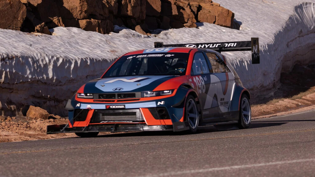 Joining Ford and Wolf Racing on the podium was Hyundai. One of its Ioniq 5 N Time Attack cars finished in 9:30.852 with Dani Sordo at the wheel. It was one of a trio of Ioniq 5 Ns that finished, one being another Time Attack car, and the other being a basically stock example. That stock example, though, apparently had a powertrain calibration specific for Pikes Peak. That roughly stock Ioniq 5 N finished 26th overall and third in the Exhibition class, which all three Hyundais participated in. Its time was 10:49.267 with Ron Zaras driving.