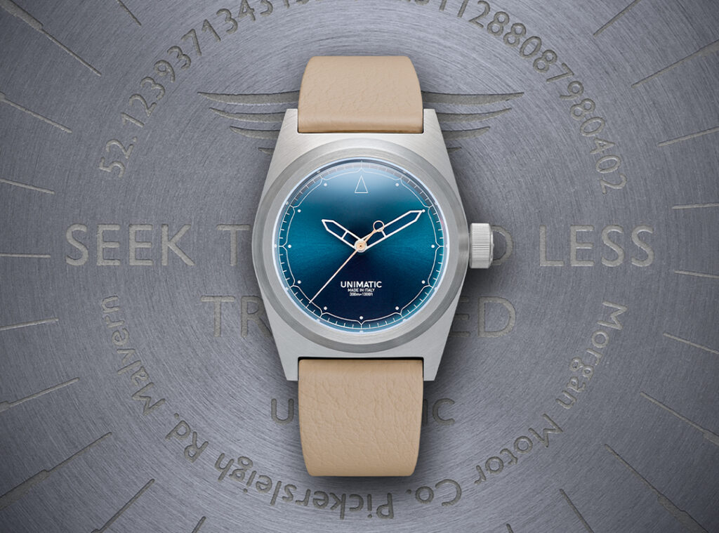 The U2-MMC is paired with two luxurious leather straps, reflecting the bespoke craftsmanship found in Morgan’s sports cars. The core strap is made from biscuit pebble leather, while the additional strap comes in black pebble leather. Both straps are crafted from the same premium leather used in Morgan’s Super 3, Plus Four, and Plus Six interiors. Stainless steel brushed hardware, signed by UNIMATIC, completes the fuel-driven design.