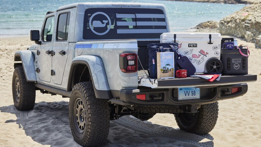 On the other side, Jeep created a custom Vineyard Vines Gladiator that some folks across the country can get close to when Jeep takes the truck on a cross-country trip to promote the collection. Stops will include “exclusive events,” and there’s a sweepstakes to win the Vineyard Vines Gladiator that you can enter now. The equipment includes Nappa leather seats, Alpine audio system, LED accessory lights, a winch, Salta wheels, a 2.5-inch suspension lift, and a “Custom fish camo finish” that doesn’t appear to have a whale in sight. We’ll guess the winning entry gets the clothing swag and Yeti coolers as well, and you can enter to win at the Vineyard Vines site right now.