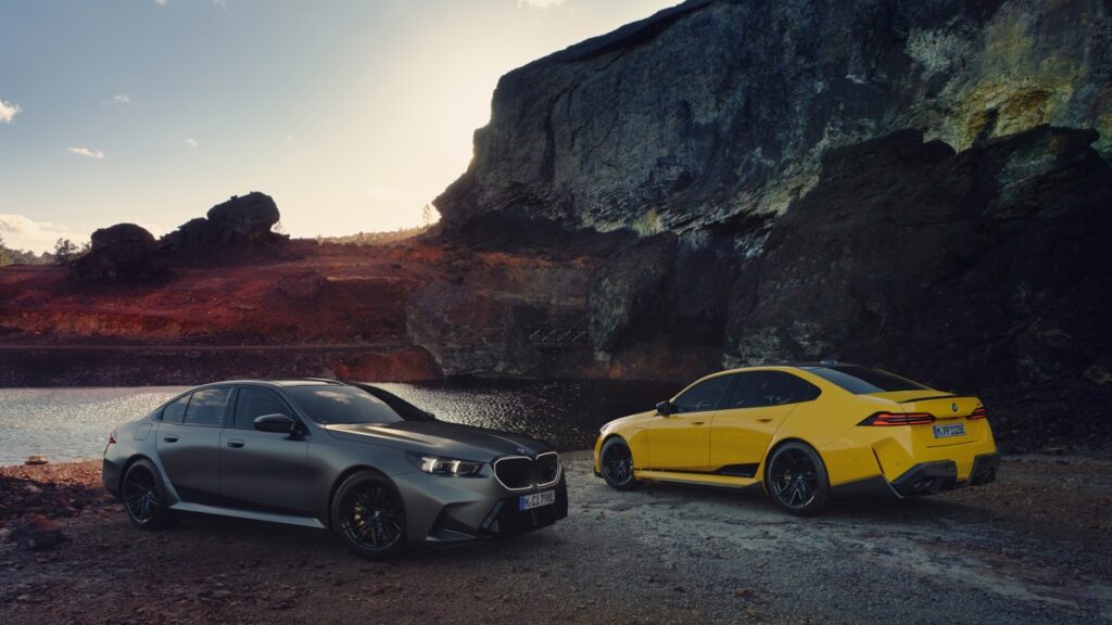 New pieces for the front and back make the most visual difference. A front lower splitter evokes the bumper’s split lower air intake, the contours at the edge of the splitter curling around the front fender to the front arch. In back, two spoilers are available, one with a notch that again recalls the front intakes and the rear diffuser, one flush all the way across. At the base, the stepped diffuser makes room for an available set of quad-pipe finishers in carbon with milled titanium end rings boasting embossed M5 graphics.