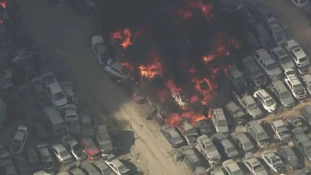 Some reports said that there were as many as 1,500 junked vehicles on the site, described as a car crusher facility. Los Angeles County Fire Department Capt. Sheila Kelliher said early indications are that the fire started due to a malfunctioning hydraulic car crusher.