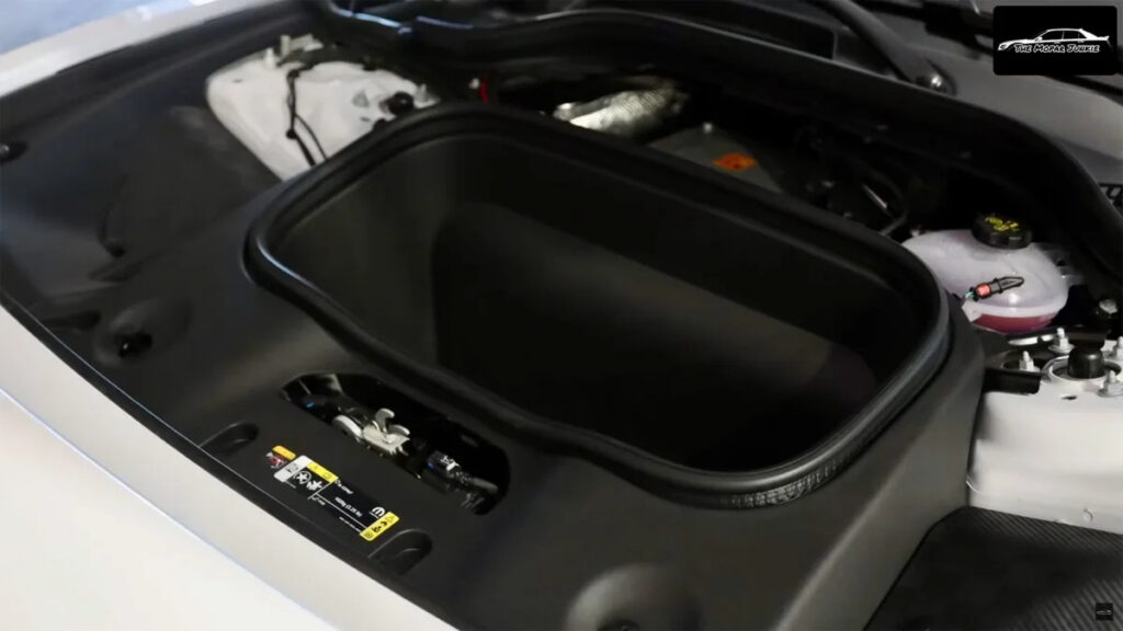 Two of our takeaways from the piece are MI calling the red car a Scat Pack First Edition, leading us to believe there are still some MSRP surprises in store after our posts about rumored pricing and official pricing. The other is clear picture of the frunk — the one that comes with the $4,995 Plus Group. It’s less a cargo storage area, more of deep, carpeted storage bin. We suspect there’s so much room in the hatched cargo area, especially with lie-flat seats, that the frunk won’t get much use, although it looks like a great space for the charging cable and other little odds & ends every driver should carry for emergencies.