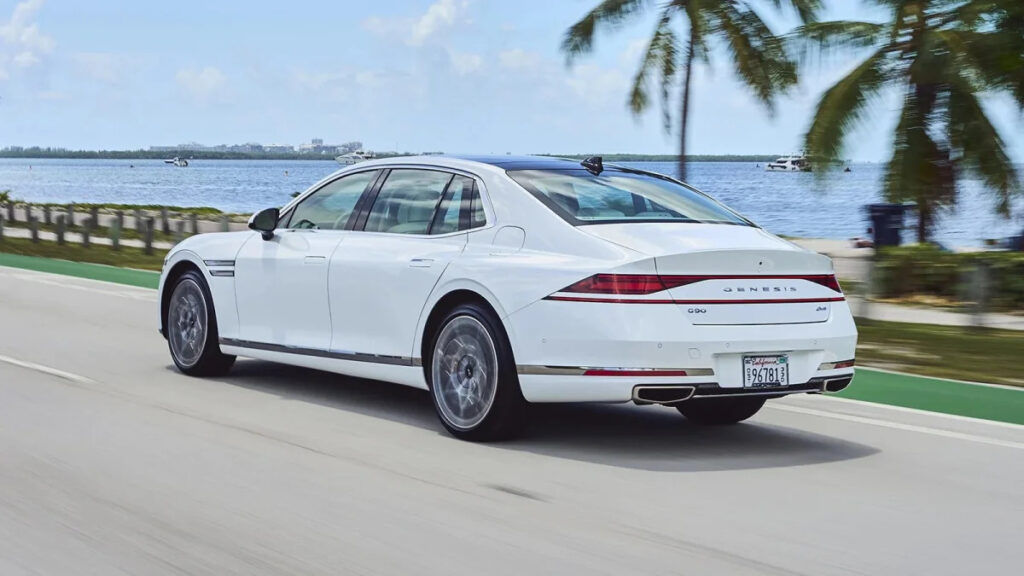 The G90’s design is still holding up since its full makeover for the 2023 model year. It’s long and low, just as a flagship sedan should be. The sloping, tapered tail is especially elegant, and the way the sides bow out below the window helps break up the height and add some visual width. Details such as the turn signals that extend past the front wheels and the chrome trim that wraps around the entire underside of the car complete the very pretty picture.