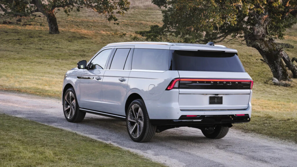 As for those hard points, the Navigator is still rolling with a body-on-frame construction, independent rear suspension and the 3.5-liter twin-turbocharged V6 paired with the 10-speed automatic transmission and all-wheel drive standard. Said engine produces 440 horsepower and 510 pound-feet of torque, the same output as the 2024 model. Both the standard length and the L model return, with the latter pictured in white just below.