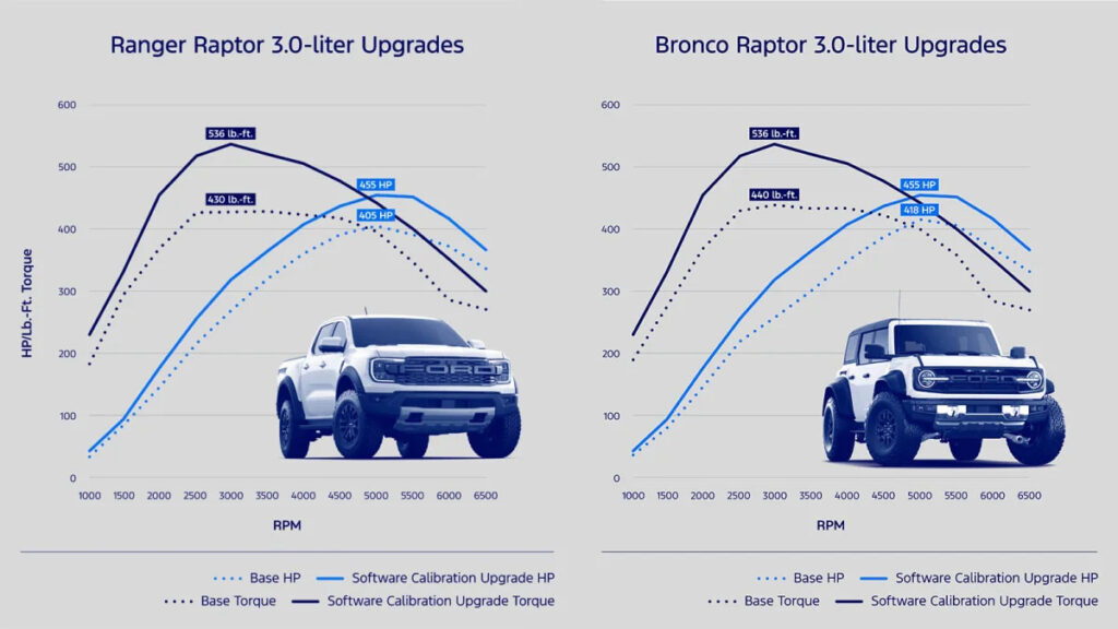 Ford shared the above charts of the performance gains on both platforms, noting that its engineers compensated for the shift in powerband by altering the throttle and transmission shift logic as well, so it’s not just a baseline increase in output. Both are available for purchase online (Bronco Here, Ranger Here) to be installed by your dealer. If installed by an authorized dealer, it’s also covered by a three-year, 36,000-mile parts warranty.
