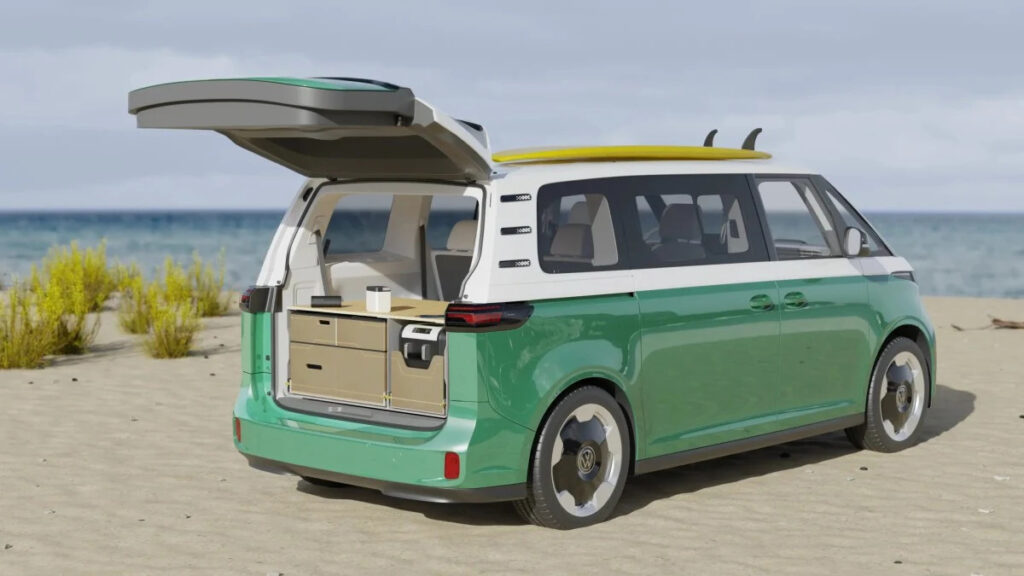 The Buzz.Box.Sleeper does what it says, adding a “nearly queen-size” bed to the rear area by making the top of the kitchen black and the folded-down rear seats a bed. It costs $10,995.