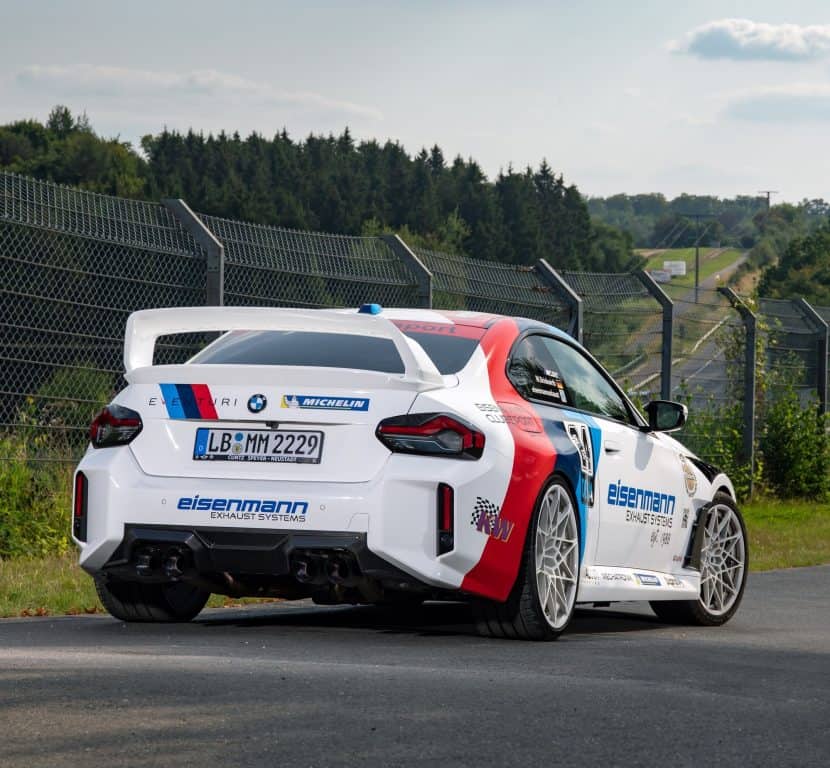 Featuring a wrap that harkens back to the M3 E30’s glory days in DTM, the M2 has been extensively modified. Of course, priority number one was to fit an Eisenmann exhaust, featuring flap control and a slip-on rear muffler. The new setup boasts quad 110-mm tips covered in carbon fiber and adorned by the company’s lettering. Alternatively, you can have the exhaust finishers in aluminum or black anodized chromium.