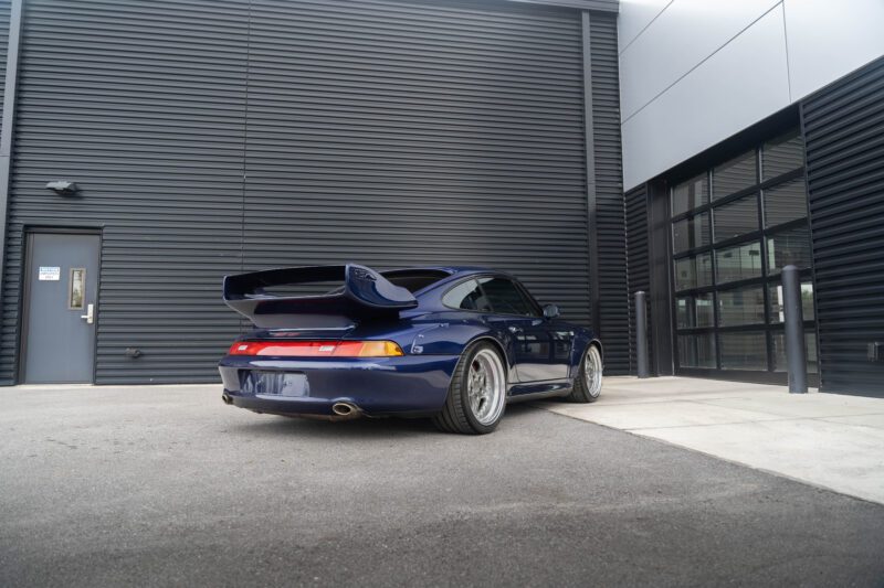 As if it couldn’t be any more of a unique build already, a factory Paint-to-Sample Iris Blue Metallic finish makes this GT2 Tribute the ultimate Porsche build. The factory GT2 widebody gives it the aggressive stance of a track star, and every detail has been carefully considered—from the GT2 uprights and adjustable control arms to the imported Rest of World (ROW) GT OEM lighting, including headlights, taillights, fog lights, and turn signals. To keep the exterior pristine for years, the car underwent a full paint correction, followed by paint protection film (PPF) and ceramic coating.