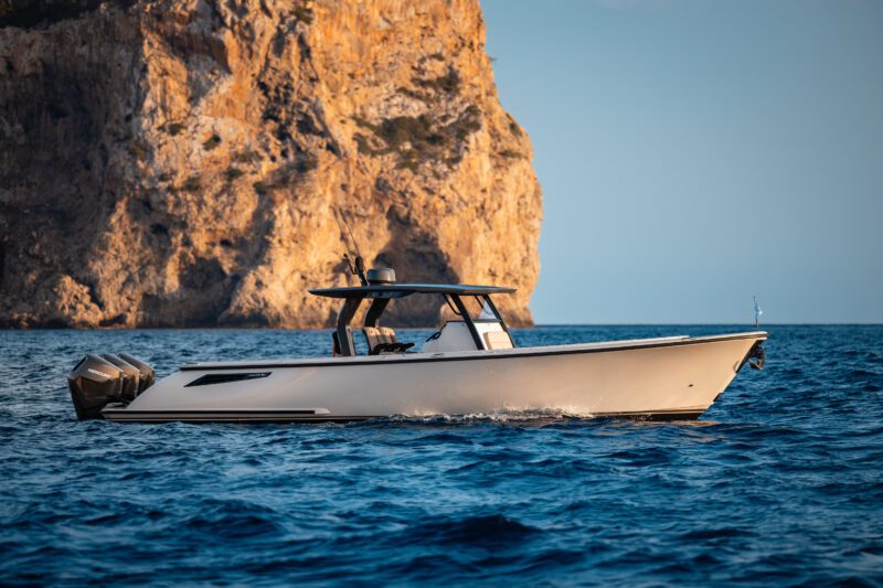 Wajer’s designs are a perfect blend of style and function, where each yacht looks like it’s beautifully slicing through the water, even when docked. The company’s dramatic transition from the first Captain’s Launch came with the debut of the Wajer 37 in 2006 and its bold push toward the future by starting from scratch to engineer a model that would set the tone for faster, open-cabin configurations. Dries notes that Wajer’s core design DNA is still found in the boats today by saying, “It’s more like an evolution of boats we do because there’s still lots of design elements which are very beautiful in the boats, like the tumblehome hull and flare in the bow.” Notable models, like the Wajer 38 and Wajer 55, are prime examples of these aesthetics, combining other signature elements like deep-riding cockpits, low window frames, and smooth, flowing hull shapes.