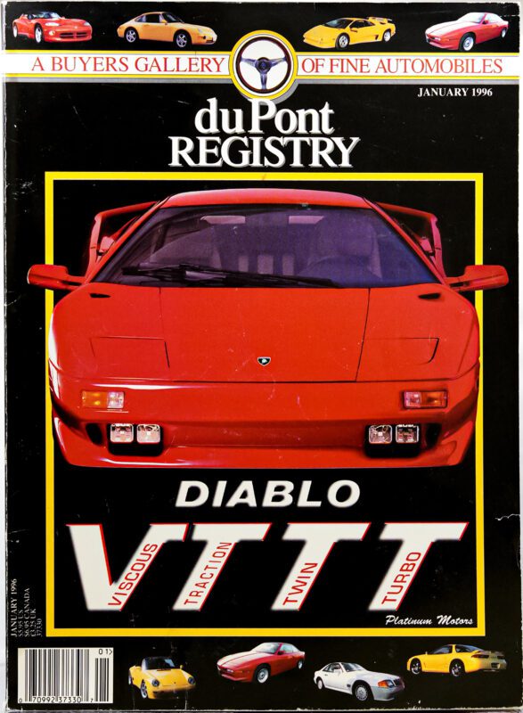 Two extra “t”s designate the fact that this Lamborghini on the January 1996 cover of duPont REGISTRY is something truly special. An example of the all-wheel drive Diablo VT, something rare in the world of supercars at the time, the twin-turbo upgrade given to this specific Diablo gives it hair-raising performance.