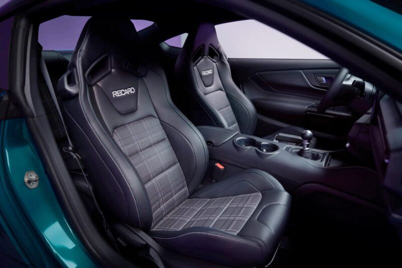Inside, the retro-throwback theme continues with a new leather upholstery with black and white perforated inserts that mimic the plaid patterns of the third-gen Mustang. Optional Recaro seats (Coupe only) also carry the same retro flair. Double contrast stitching in City Silver and Adriatic Blue, across the seats, dash, steering wheel, and doors, along with new seat belt options in International Orange, Prime Blue, or Black with red stripes, ties everything together.