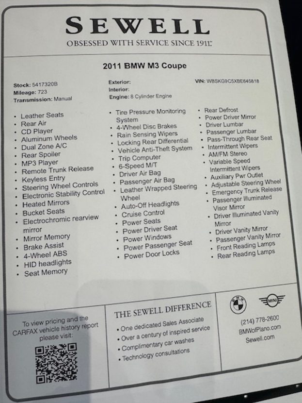 Someone just traded in a 2011 BMW M3 at Sewell BMW in Plano with 723 miles on the odometer. The car is 15 years old. It was never broken in. A forum member going by the name Frank spotted it while picking up his own car from service — black, manual, coupe, just sitting in the lot. The window sticker said 723 miles and he assumed someone had made a typo. They hadn’t. He posted about it and other forum members immediately pulled the CARFAX.